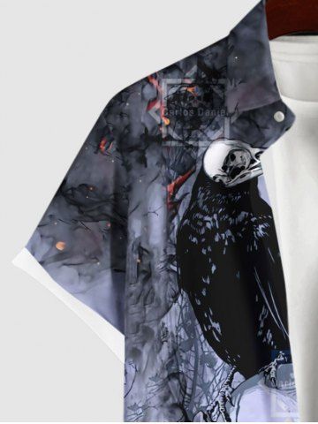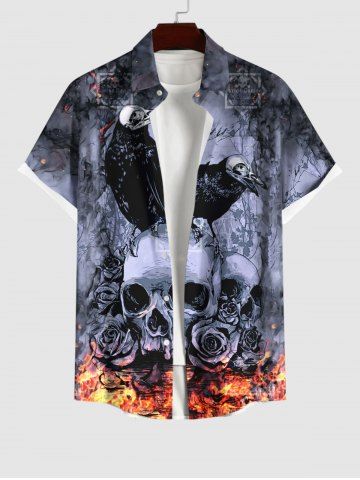 Men > Plus Size Distressed Crow Skull Rose Flower Fire Flame Print Halloween Button Pocket Shirt For Men