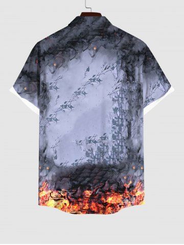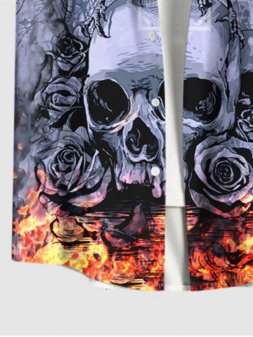 Plus Size Distressed Crow Skull Rose Flower Fire Flame Print Halloween Button Pocket Shirt For Men - Multi-a - 4xl