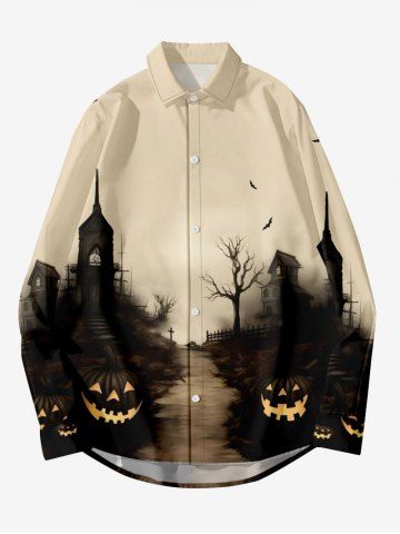 Men > Plus Size Distressed Pumpkin Castle Tree Bird Print Halloween Button Long Sleeves Shirt For Men