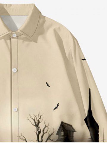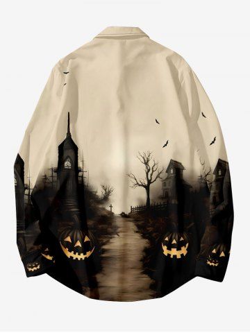 Men > Plus Size Distressed Pumpkin Castle Tree Bird Print Halloween Button Long Sleeves Shirt For Men