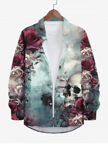 Men > Plus Size Distressed Rose Flower Skull Tie Dye Ombre Print Halloween Button Long Sleeves Shirt For Men