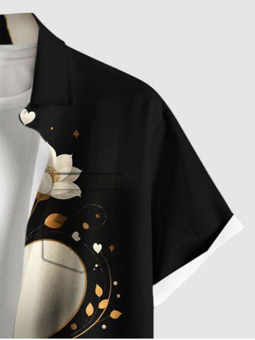 Plus Size Flower Heart Print Valentines Button Pocket Shirt For Men - Black - 5xl