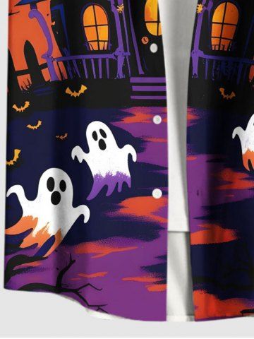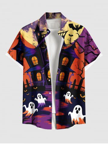 Men > Plus Size Ghost Castle Tree Bat Moon Print Halloween Button Pocket Shirt For Men