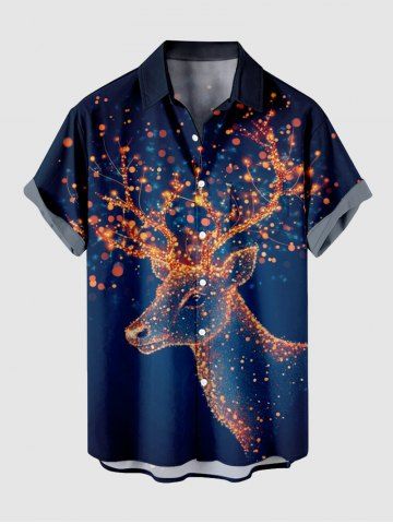 Plus Size Glitter Christmas Elk Light Spot Print Ombre Button Pocket Shirt For Men - Navy Blue - S