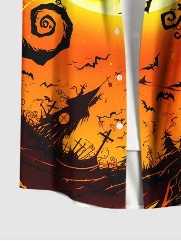 Plus Size Glitter Moon Bat Castle Spiral Tree Skull Print Halloween Buttons Pocket Shirt For Men - Orange - 3xl