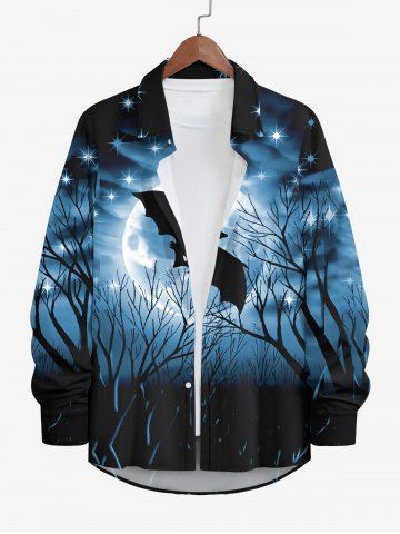 Plus Size Halloween Bat Star Moon Trees Print Buttons Pocket Long Sleeve Shirt For Men - Black - 7xl