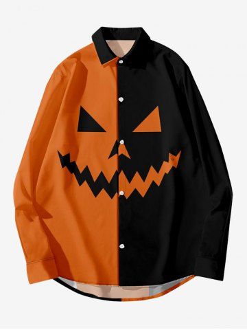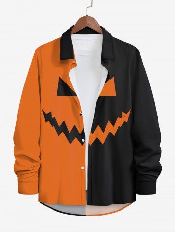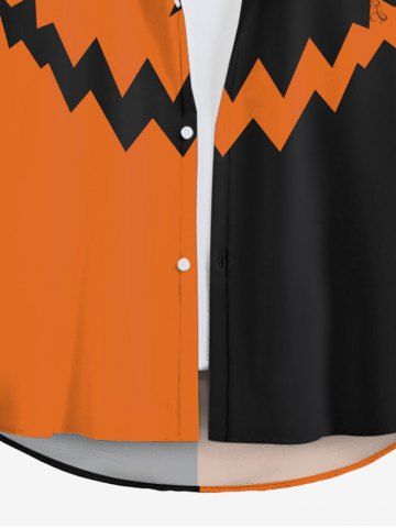 Men > Plus Size Halloween Contrast Colorblock Pumpkin Face Print Buttons Long Sleeve Shirt For Men