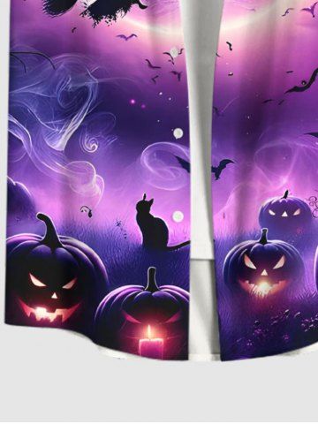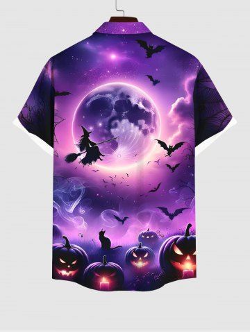 Plus Size Halloween Costume Galaxy Bat Moon Pumpkin Latern Cat Print Buttons Pocket Shirt For Men - Purple - M