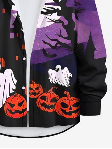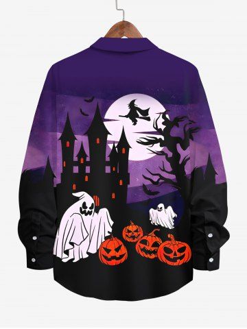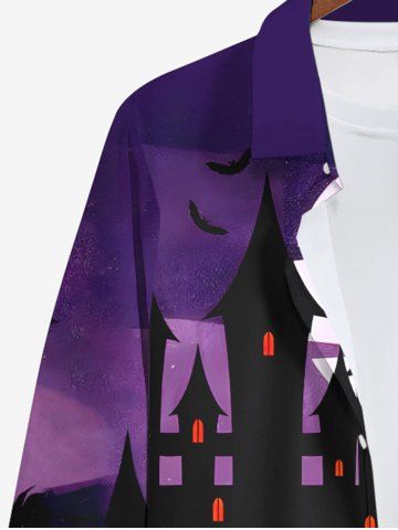 Plus Size Halloween Costume Ghost Pumpkin Moon Bat Print Buttons Long Sleeve Shirt For Men - Purple - Xl