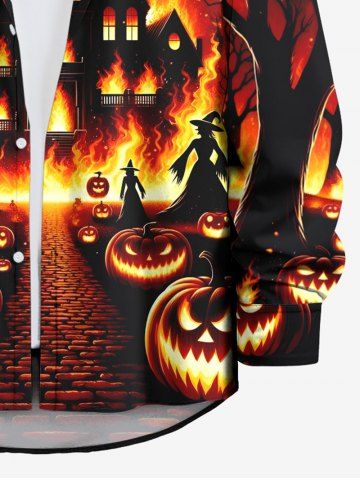 Men > Plus Size Halloween Costume Pumpkin Moon Fire Flame Tree Print Buttons Long Sleeve Shirt For Men