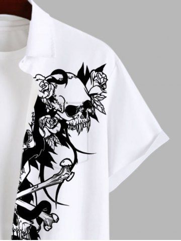 Plus Size Halloween Costume Skull Flowers Leaf Print Buttons Pocket Shirt For Men - White - L