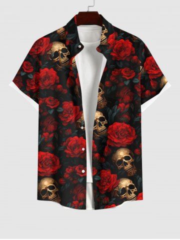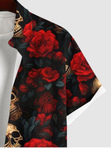 Men > Plus Size Halloween Costume Skulls Rose Flower Print Buttons Pocket Shirt For Men
