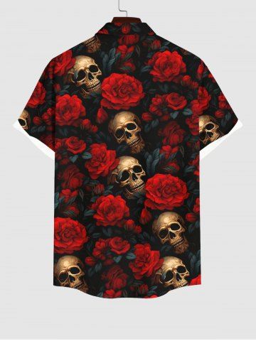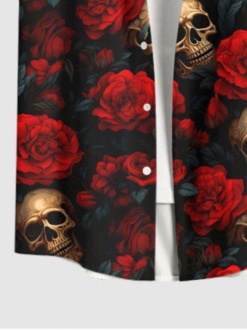 Plus Size Halloween Costume Skulls Rose Flower Print Buttons Pocket Shirt For Men - Black - 2xl