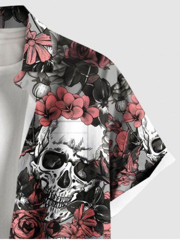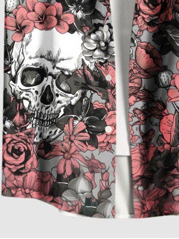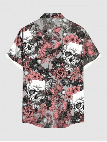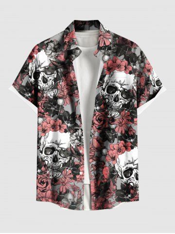 Plus Size Halloween Costume Skulls Rose Flowers Print Buttons Pocket Shirt For Men - Dark Gray - L