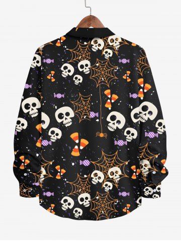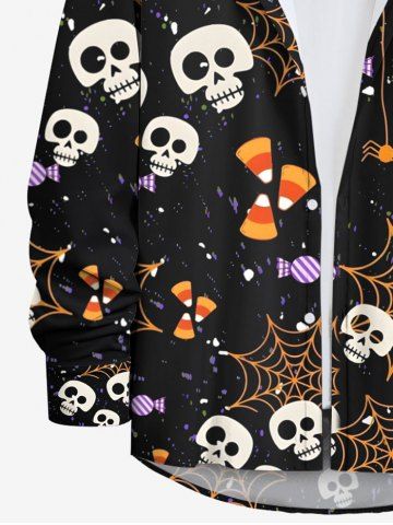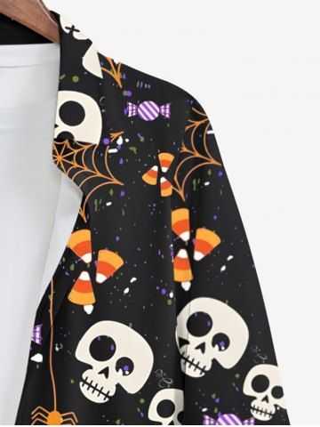 Plus Size Halloween Costume Skulls Spider Web Candy Print Buttons Long Sleeve Shirt For Men - Black - 7xl