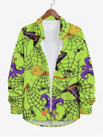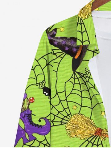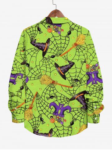 Plus Size Halloween Costume Spider Web Hat Boots Broom Print Buttons Long Sleeve Shirt For Men - Green - Xl