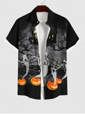 Plus Size Halloween Ghost Pumpkin Moon Fence Tree Castle Print Buttons Pocket Shirt For Men - Black - L