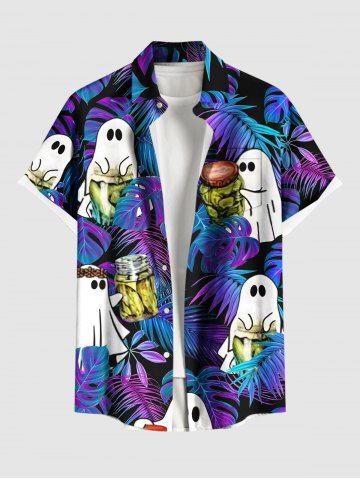 Men > Plus Size Halloween Ghost Tropical Leaf Bottles Print Buttons Pocket Hawaii Shirt For Men