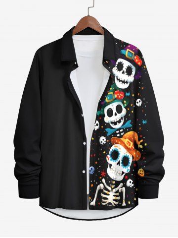 Plus Size Halloween Hat Skulls Skeleton Flowers Pumpkin Print Buttons Long Sleeve Shirt For Men - Black - 7xl