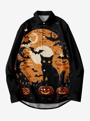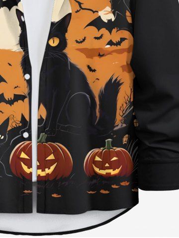 Men > Plus Size Halloween Moon Cat Bat Pumpkin Print Buttons Long Sleeve Shirt For Men