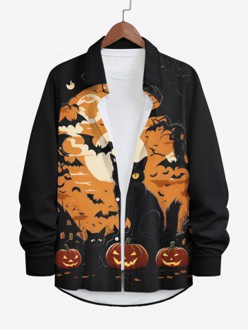 Plus Size Halloween Moon Cat Bat Pumpkin Print Buttons Long Sleeve Shirt For Men - Black - 7xl