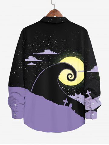 Plus Size Halloween Moon Cross Tomb Cloud Colorblock Print Buttons Long Sleeve Shirt For Men - Black - Xl