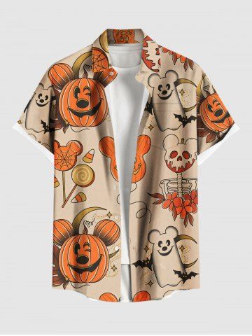 Plus Size Halloween Pumpkin Balloon Candy Skeleton Flowers Print Buttons Pocket Shirt For Men - Apricot - M