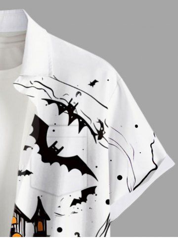 Plus Size Halloween Pumpkin Bat Castle Print Buttons Pocket Shirt For Men - White - Xl