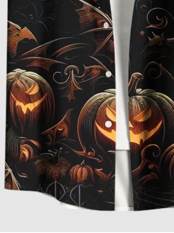 Plus Size Halloween Pumpkin Bat Floral Pattern Print Buttons Pocket Shirt For Men - Black - S