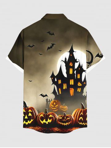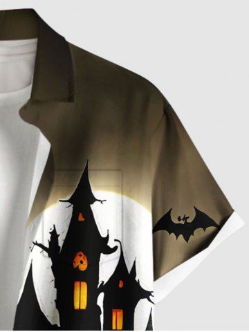 Plus Size Halloween Pumpkin Bat Moon Ombre Castle Print Buttons Pocket Shirt For Men - Brown - 4xl