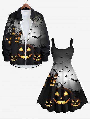 Men > Plus Size Halloween Pumpkin Bat Moon Tree Castle Print Buttons Pocket Long Sleeve Shirt For Men