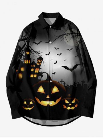 Plus Size Halloween Pumpkin Bat Moon Tree Castle Print Buttons Pocket Long Sleeve Shirt For Men - Black - 7xl