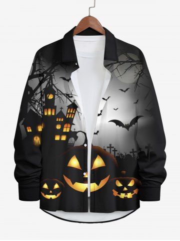 Plus Size Halloween Pumpkin Bat Moon Tree Castle Print Buttons Pocket Long Sleeve Shirt For Men - Black - 8xl