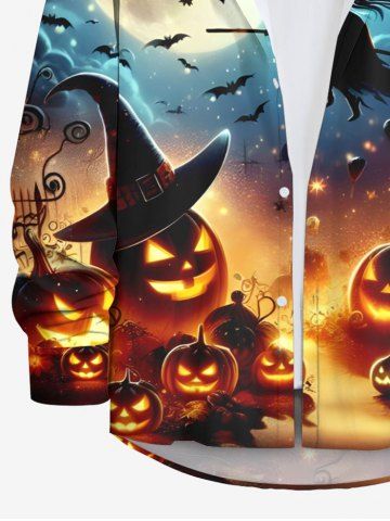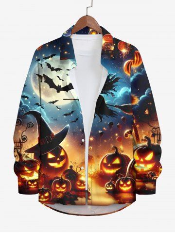 Men > Plus Size Halloween Pumpkin Bat Moon Wizard Galaxy Print Buttons Long Sleeve Shirt For Men