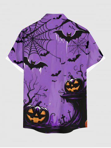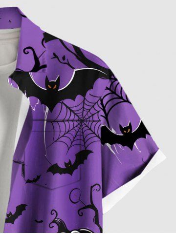 Plus Size Halloween Pumpkin Bat Spider Web Cross Print Buttons Pocket Shirt For Men - Purple - Xl