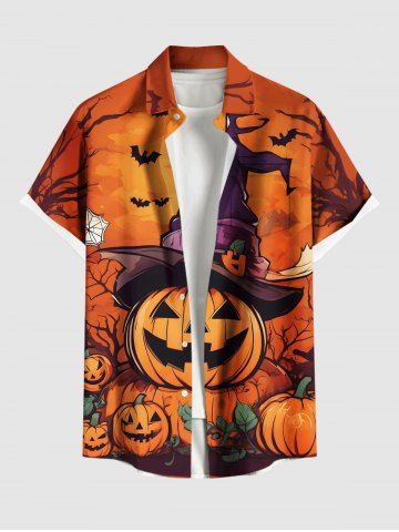Plus Size Halloween Pumpkin Bat Spider Web Print Buttons Pocket Shirt For Men - Orange - M
