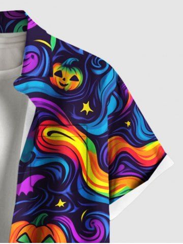 Plus Size Halloween Pumpkin Bat Star Rainbow Swirls Print Buttons Pocket Shirt For Men - Purple - 6xl