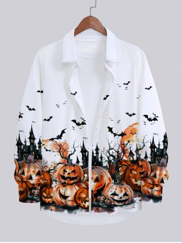 Plus Size Halloween Pumpkin Bat Tree Castle Print Buttons Long Sleeve Shirt For Men - White - 5xl