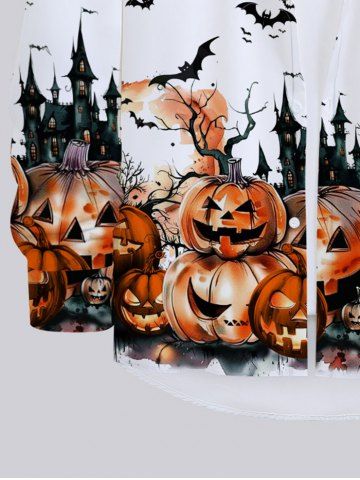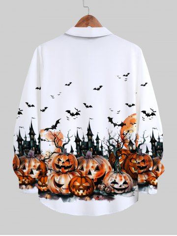 Plus Size Halloween Pumpkin Bat Tree Castle Print Buttons Long Sleeve Shirt For Men - White - 6xl
