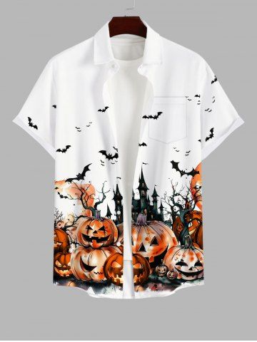 Plus Size Halloween Pumpkin Bat Tree Castle Print Buttons Pocket Shirt For Men - White - M