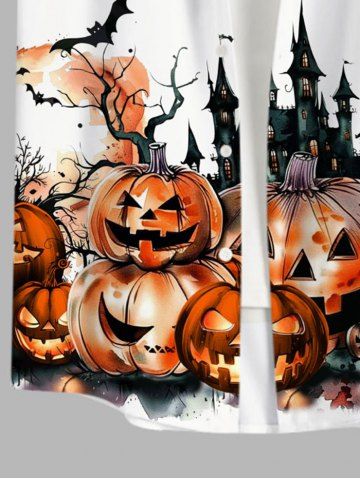 Plus Size Halloween Pumpkin Bat Tree Castle Print Buttons Pocket Shirt For Men - White - L
