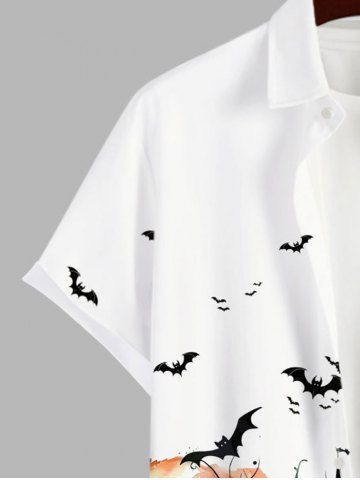 Plus Size Halloween Pumpkin Bat Tree Castle Print Buttons Pocket Shirt For Men - White - 2xl