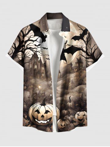 Plus Size Halloween Pumpkin Bat Tree Castle Print Buttons Pocket Shirt For Men - Light Brown - L