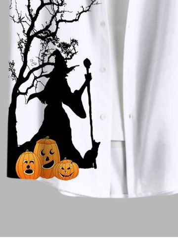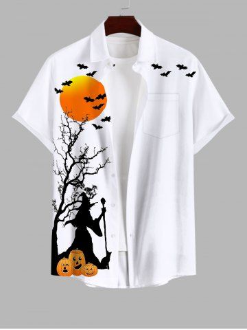 Plus Size Halloween Pumpkin Bat Tree Moon Wizard Print Buttons Pocket Shirt For Men - White - 3xl