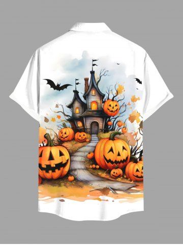 Plus Size Halloween Pumpkin Castle Bat Print Buttons Pocket Shirt For Men - White - S