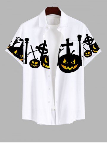 Plus Size Halloween Pumpkin Cross Skeleton Claw Print Buttons Pocket Shirt For Men - White - L