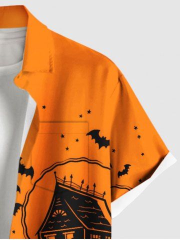 Plus Size Halloween Pumpkin Ghost Bat Cat Colorblock Print Buttons Pocket Shirt For Men - Orange - M