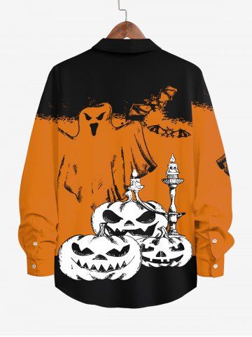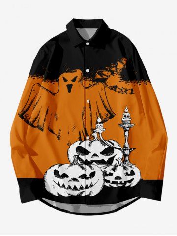 Men > Plus Size Halloween Pumpkin Ghost Candles Bat Colorblock Print Buttons Shirt For Men