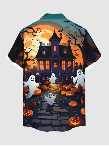 Men > Plus Size Halloween Pumpkin Ghost Moon Bat Tree Print Buttons Pocket Shirt For Men