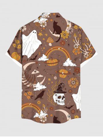 Plus Size Halloween Pumpkin Ghost Skull Flowers Mushroom Print Buttons Pocket Shirt For Men - Light Brown - S